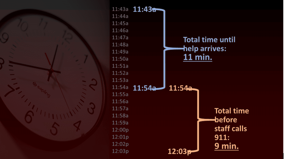 In all, it took 20 minutes from when the respiratory distress started until 911 was even called. It took 11 minutes from when the RT entered the room until 911 was called. See the attached timeline which was the last slide of a power point which walked the jury through events.