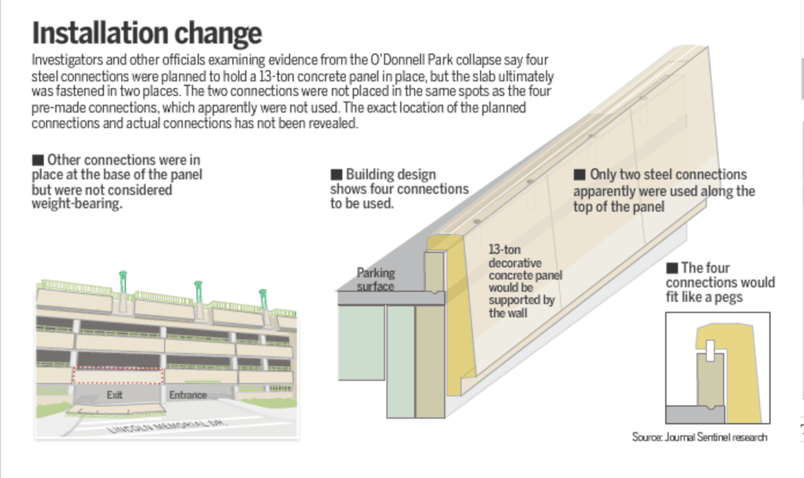 What happened that day was unimaginable but, as we now know, preventable. The panel that fell was one of hundreds of panels that were custom designed and manufactured by Advanced Cast Stone to decoratively clad the parking structure. The panels were formed as an inverted “L,” such that the panel would rest on the upper lip of the parking structure and then cover the exterior wall of the parking structure. What the panel was resting on is called a “parapet wall,” constructed by C.D. Smith. Engineering specifications called for very specific top connections to hold these panels to the parapet wall. Most simply, four stainless steel pins were to be threaded up into the underside of the panel’s upper lip to form a “male” connection, while four steel cups were to be poured in place in the parapet wall as a “female” connection. The stainless steel pins were supposed to be dropped down into the steel cups that were filled with grout to form four solid connections. The best visual depiction for how the panel was designed to be connected to the parapet wall is contained in the following demonstrative graphic from the Milwaukee Journal Sentinel: